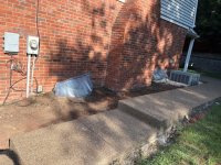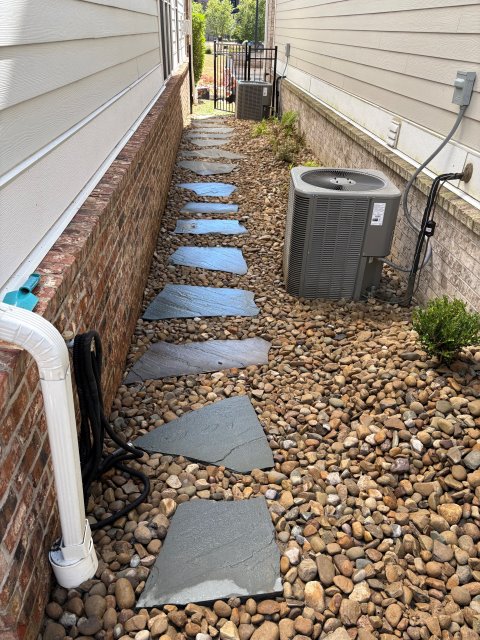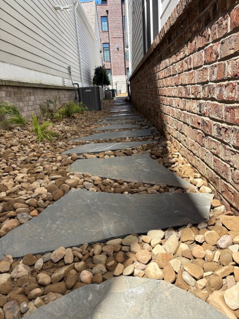 Removed existing grass. Installed weed block paper, flag stone pathway and new plants.